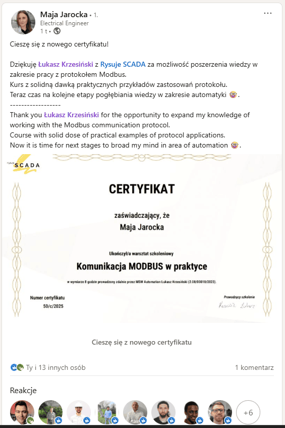 Jest dla Ciebie idealny! Kurs prowadzi Cię od podstaw - czym jest MODBUS, jak działa, różnice między RTU/ASCII/TCP, a kończy na praktycznej integracji z PLC, HMI i falownikami. Po kursie będziesz samodzielnie integrować urządzenia przez MODBUS.