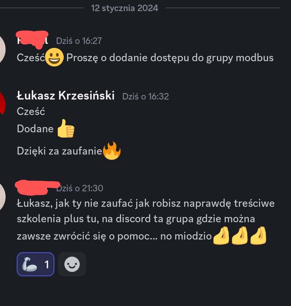 Dostajesz dostęp do zamkniętej społeczności, gdzie możesz zadawać pytania, konsultować problemy projektowe i korzystać z doświadczeń innych automatyków.